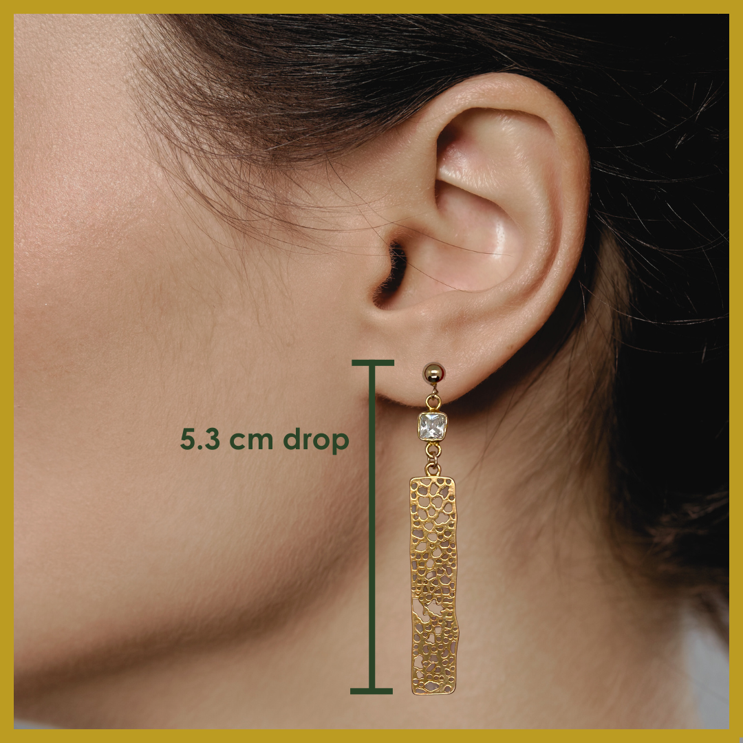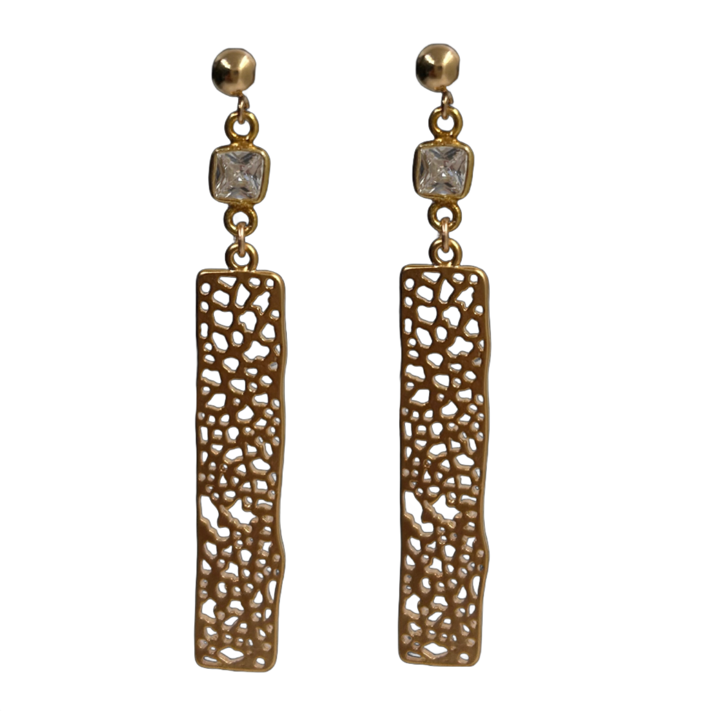 These rectangular gold-filled earrings with irregular cutouts are finished with a square cubic zirconia stone and 14k gold-filled stud, perfect to zjoosh up your evening wear.
