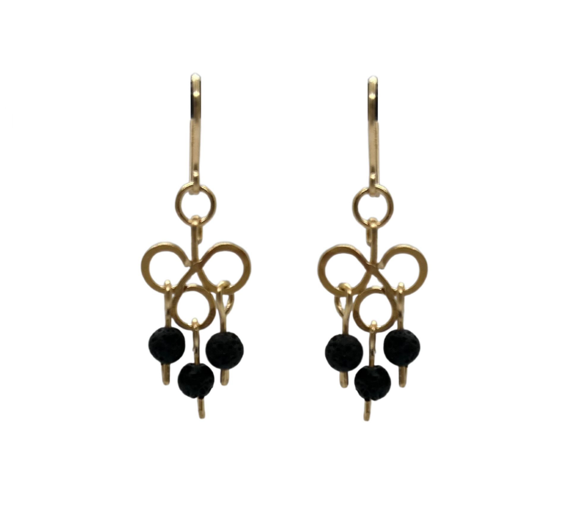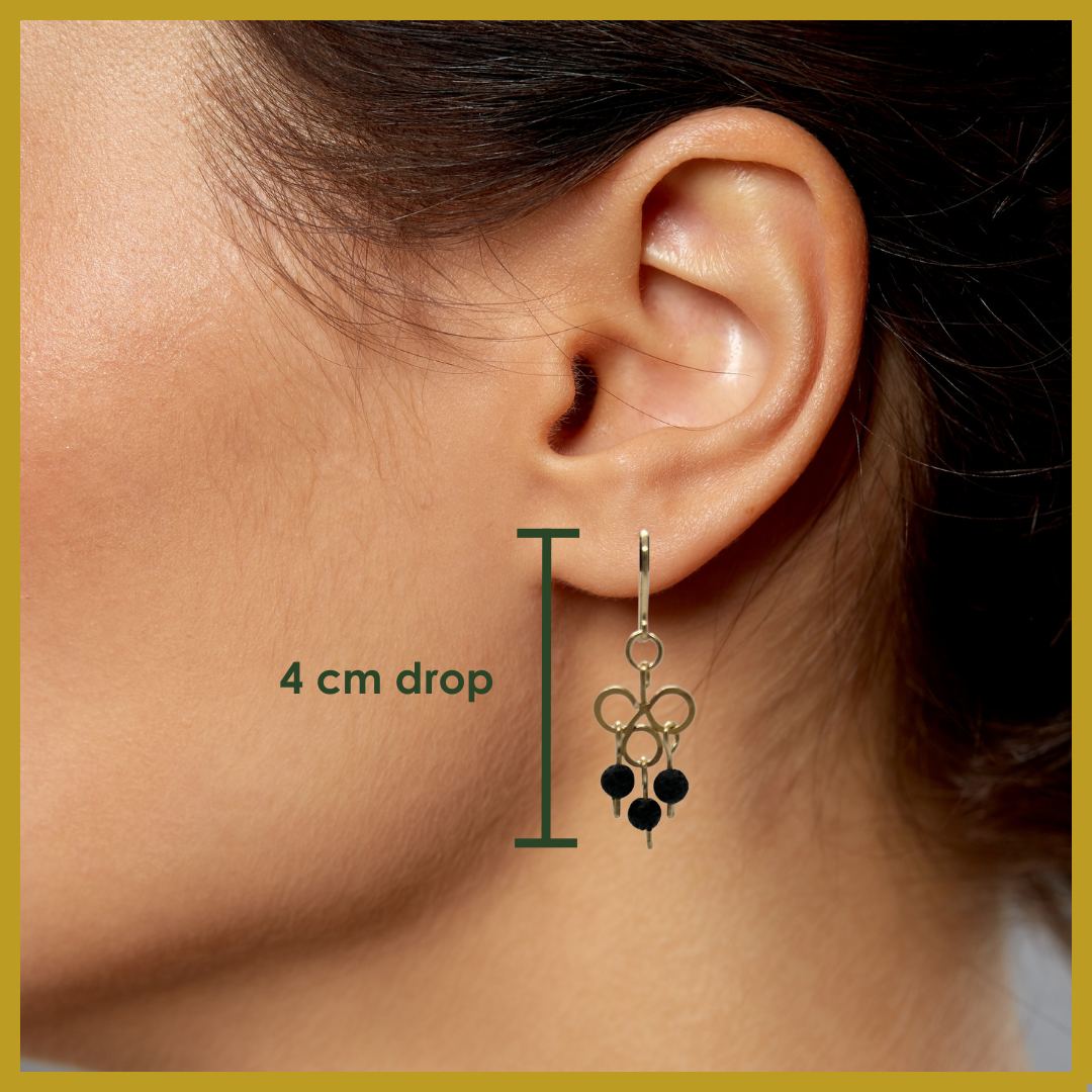 These earrings are inspired by an infusion of classic French iron work with heritage Indian jewellery. Made from hammered 14k gold-filled wire and lava rocks, these form part of our classic black and gold collection.