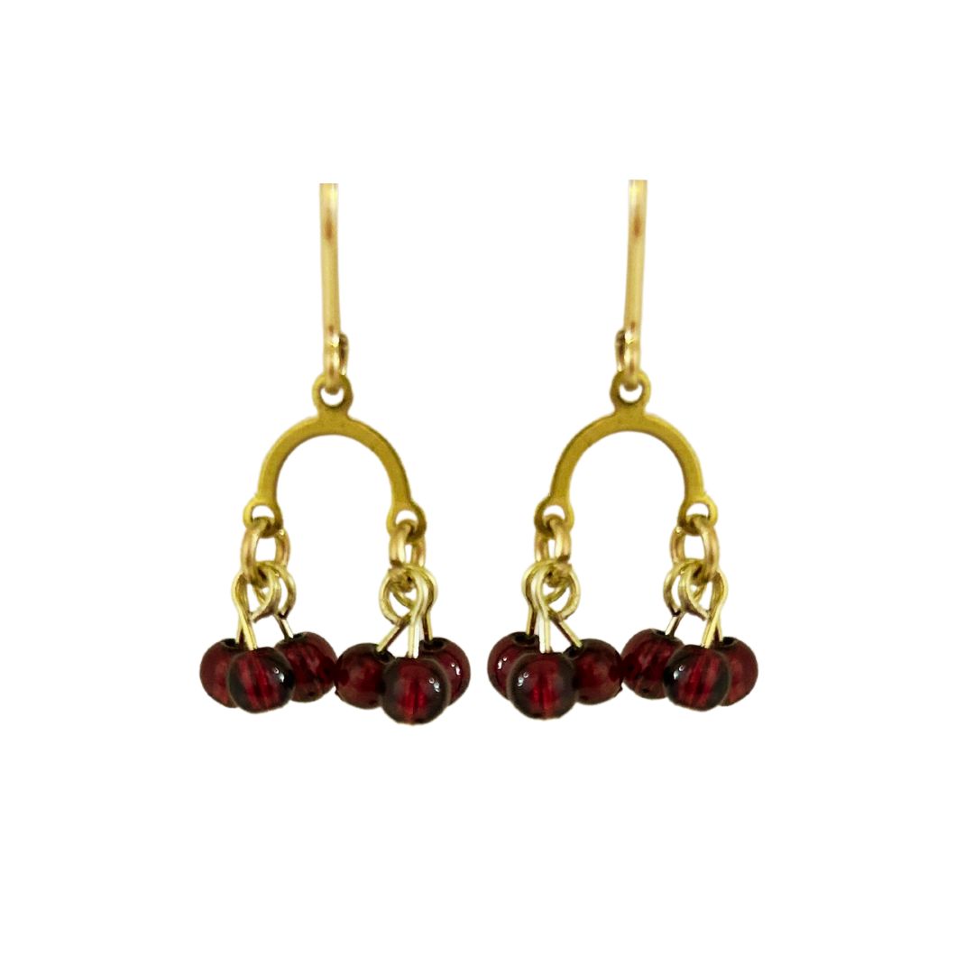 The second generation of our Valentin earrings are made with 14k gold filled hooks and beads, red garnet and a brass frame. They have a small drop of 3cm.